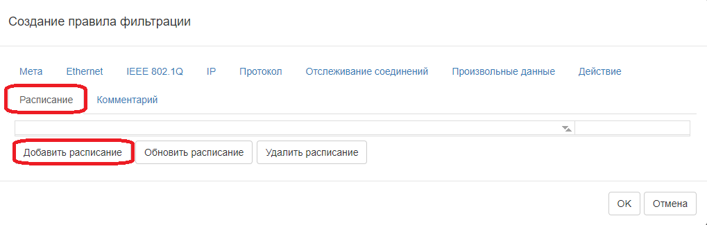 Для добавления правила фильтрации необходимо нажать на кнопку «Добавить правило». В новом окне на вкладе «Протокол» в поле «Протокол» необходимо выбрать протокол TCP, в поле «Порт назначения» необходимо задать 80 порт. На вкладке «Расписание» необходимо создать расписание для правила фильтрации. Для создания расписание необходимо нажать на кнопку «Добавить расписание».