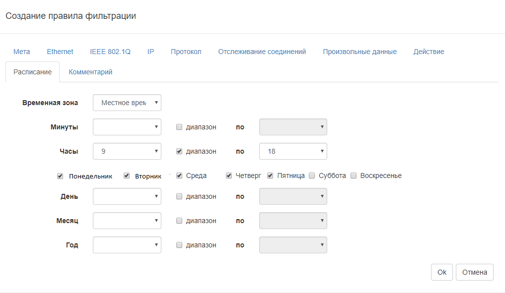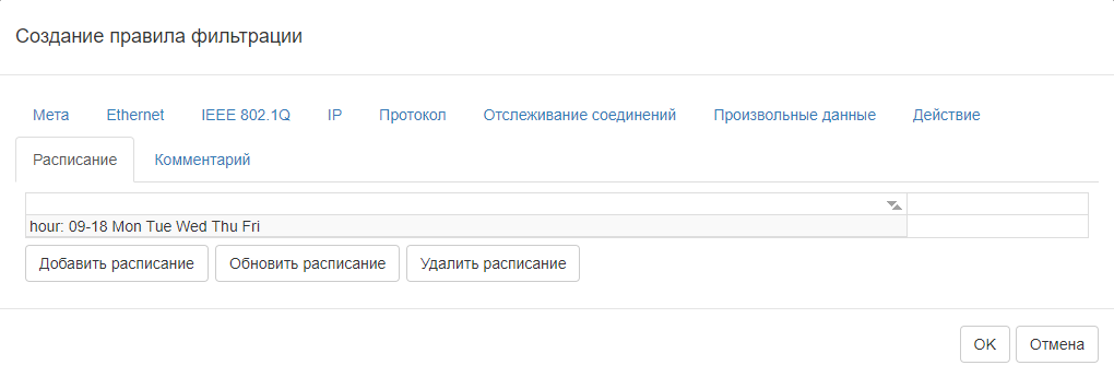 В новом окне необходимо установить флаг «Часы диапазон», в поле «Часы» необходимо задать время работы правила фильтрации и задать дни недели. После задания расписания его можно изменить или удалить с помощью дополнительных кнопок «Обновить расписание» и «Удалить расписание. На вкладке «Действие» в поле «Действие» необходимо выбрать действие «Drop».