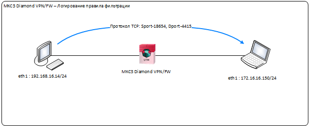 С помощью настроек необходимо реализовать сценарий, по которому на устройстве МКСЗ Diamond VPN/FW, будет настроено правило фильтрации, которое запрещает трафик для протокола TCP с порта 18654 на порт 4415 с установленным битом syn с устройства с ip-адресом 192.168.16.14/24 к устройству с ip-адресом 172.16.16.150/24.