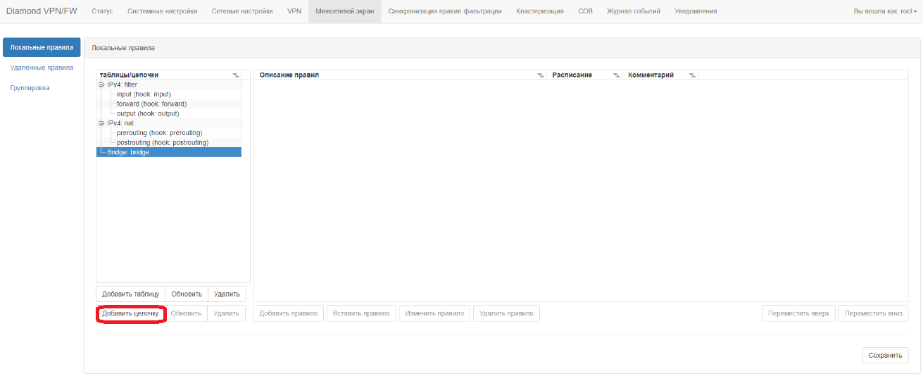 Далее необходимо выбрать новую таблицу «bridge» и создать в ней цепочку для правил фильтрации. Для создания новой цепочку правил фильтрации необходимо нажать на кнопку «Добавить цепочку».