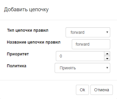 В новом окне «Добавить цепочку» в поле «Тип цепочки правил» необходимо выбрать тип «forward» для транзитного трафика, в поле «Название цепочки правил» необходимо задать название – «forward» и нажать на кнопку «ОК».