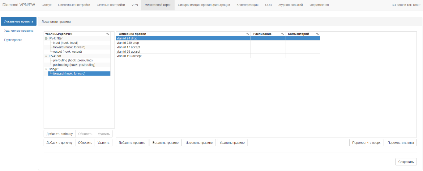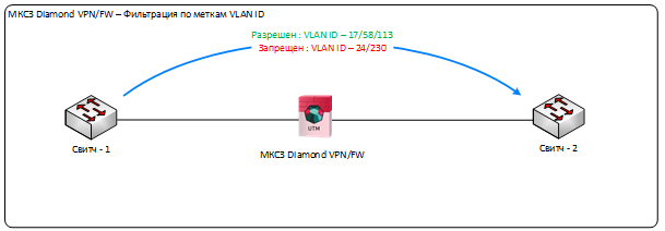 С помощью настроек необходимо реализовать сценарий, по которому на устройстве МКСЗ Diamond VPN/FW будет настроено правило фильтрации для поля VLAN ID для второго уровня стандартной сетевой модели. Сетевой трафик на втором уровне стандартной сетевой модели не участвует в процессе маршрутизации и в сетевых пакетах не происходит подмены MAC адресов. Для сторонних устройств МКСЗ Diamond VPN/FW будет прозрачным. По сценарию разрешен сетевой трафик с метками VLAN ID 17/58/113 и запрещен трафик с метками VLAN ID 24/230.