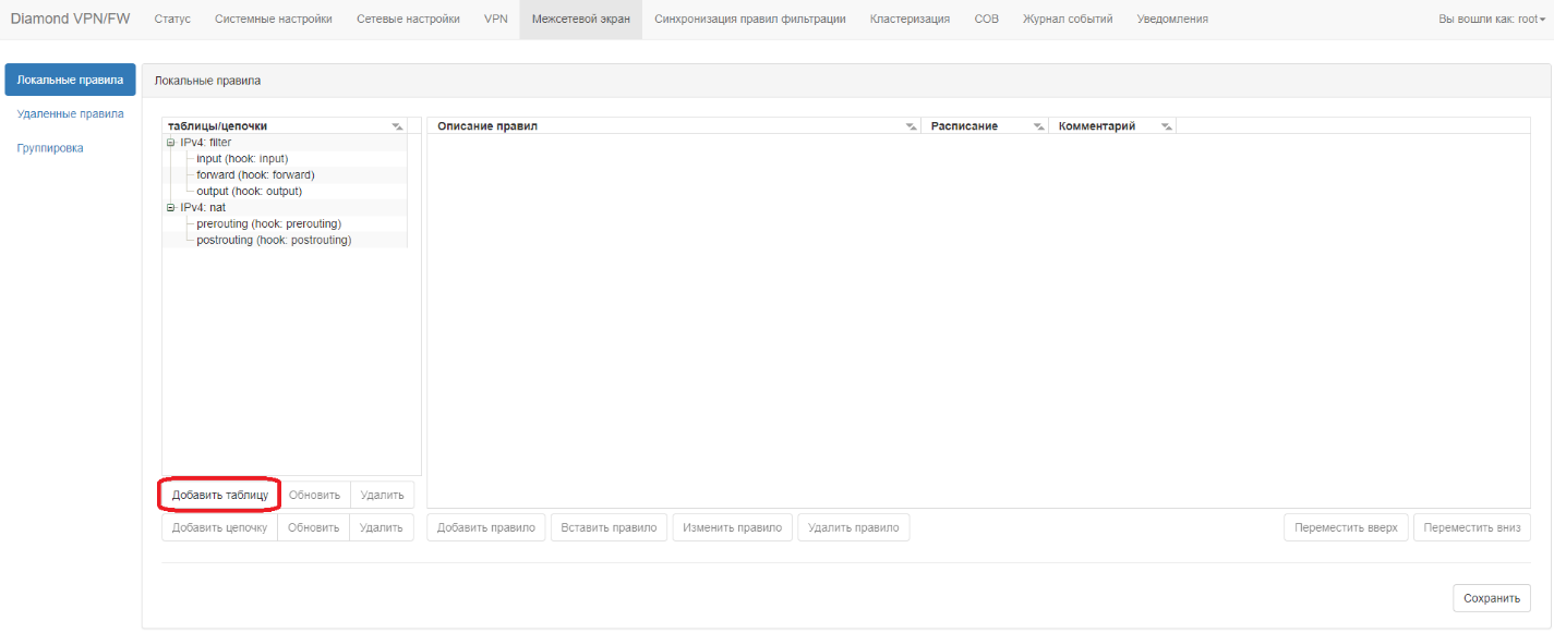 Для создания правила фильтрации на уровне L2 стандартной сетевой модели необходимо в главном меню выбрать пункт «Межсетевой экран – Локальные правила». В таблице «Локальные правила» необходимо нажать на кнопку «Добавить таблицу».
