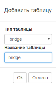 В новом окне «Добавить таблицу» в поле «Тип таблицы» необходимо выбрать пункт «bridge», в поле «Название таблицы» необходимо задать название таблицы – «bridge».