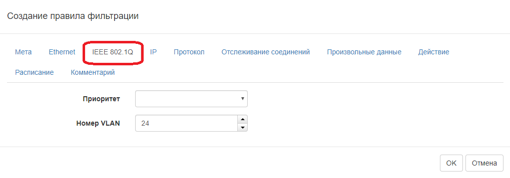 Аналогичным образом необходимо создать запрещающее правило фильтрации для метки VLAN ID 230 и разрешающее правило фильтрации для метки VLAN ID 17, 58 и 113.