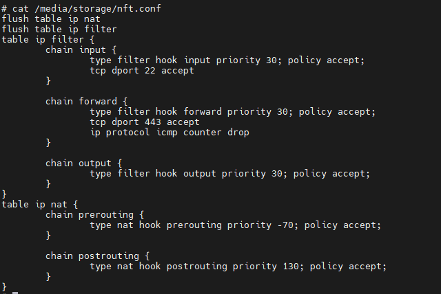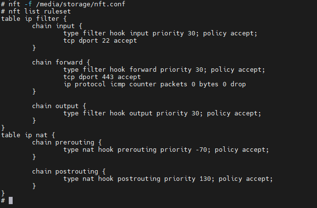 Также есть возможность загрузить правила из файла с помощью команды: nft -f /etc/nftables.conf