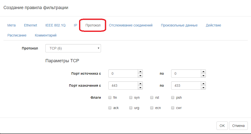 На вкладке «Протокол» в поле «Протокол» необходимо задать протокол «TCP», в поле «Порт назначения» необходимо задать порт номер 443 для протокола https.