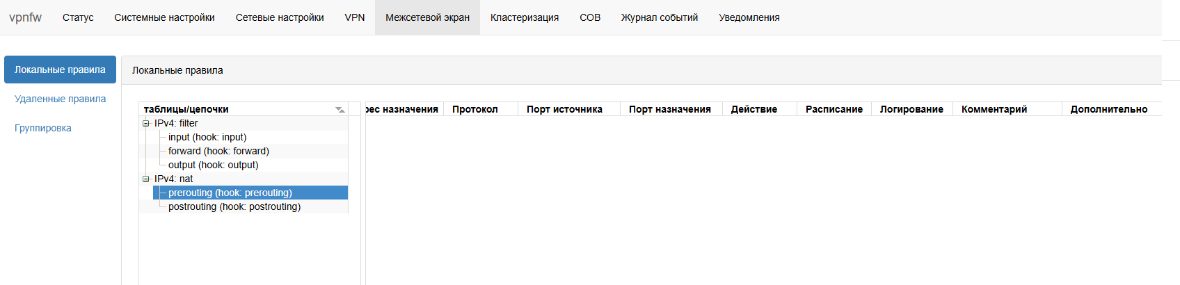 Для создания правила Port-forward необходимо в главном меню выбрать пункт «Межсетевой экран – Локальные правила». В таблице «Локальные правила» необходимо выбрать цепочку правил «Prerouting» и нажать на кнопку «Добавить правило».