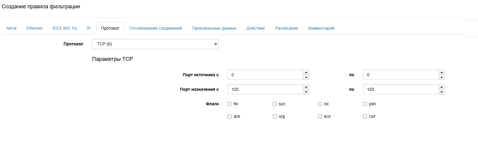 В пункте «Протокол» выбрать протокол и порт назначения, который нужно будет подменить.