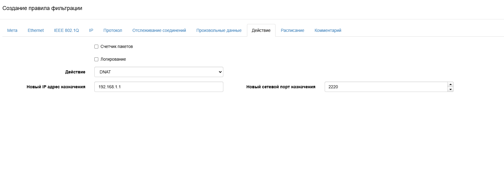 В пункте «Действие» указать в поле «Новый IP адрес назначения» адрес назначения, на который будет происходить подмена IP назначения. Далее указать «Новый сетевой порт назначения» - это порт, на который будет происходить подмена порта назначения. Далее выбрать действие DNAT и нажать на кнопку «ОК».